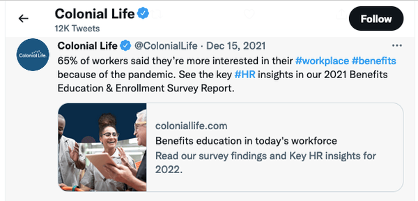 Twitter • 15th December 2021 Twitter: Benefits education in today's workforce. Key HR insights in 2022
